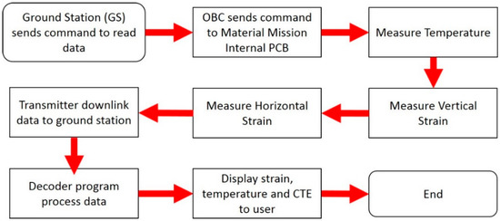 The general process flow for MM starts when the ground station transmits a command to the internal PCB via onboard computer (OBC) to read temperature and strain measurements. Data is then transmitted to the ground station. A decoder program developed using C language converts the data packets into strain, temperature and CTE values. Figure 8 illustrates the overall MM mission operations process flow. The user can set the number of measurements or packet number for each operation session. One packet of data has a size of 60 bytes. The usage of amateur radio with limited bandwidth for communication between the ground station and satellite limits the amount of MM data that can be downloaded in one pass. Moreover, Ten-Koh has other payloads that generate data. This also contributes to limit the amount of MM data that can be transmitted to the ground station. As a result, MM operations were limited to real-time measurements when Ten-Koh passes over the KIT ground station.