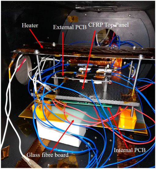 The surface temperature of the sample recorded by thermocouple was compared with those measured by the temperature sensors. The CTE measurement by the MM circuit was compared with CTE data obtained using a TM-7000 (Advance Riko, Yokohama, Japan) Thermomechanical Analyzer (TMA) provided by Agne Technology Center Company, Tokyo, Japan. Identical external PCB, internal PCB and CF/PEEK samples designed for the FM model were used for the ground test. The number of samples was three which was the same with the FM model. Thermocouples were attached to the sample and temperature sensors for comparison purposes. Polyimide heaters were attached to the heater frame made of aluminium to allow uniform distribution of heat to the samples. Heat was indirectly distributed to the samples via radiation from the aluminium frame. Black paint was also applied to the aluminium frame to increase the amount of radiated heat. The test setup is illustrated in Figure 9.