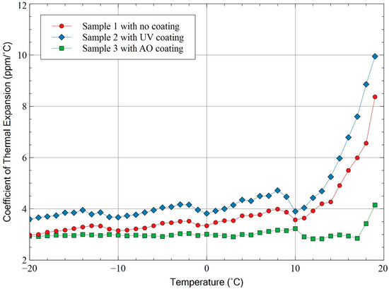 The overall results from the ground test are shown in Figure 10. For each data point, the median values of strain and temperature range were used for calculation of CTE. Figure 10 showed that the value of CTE varied with increasing temperature. This was consistent with results from previous studies [4,8,29,30]. Sample 2 had the highest range of CTE compared to sample 1 and 3. CTE varied between 2.98 and 3.99 ppm/°C for sample 1 and between 2.93 and 3.23 ppm/°C for sample 2 for temperature up to 10 °C. However, after 10 °C there was a big increase in CTE value up to a maximum of 8.37 ppm/°C and 9.95 ppm/°C for samples 1 and 2, respectively. For sample 3, CTE remained stable until 17 °C before increasing to 4.15 ppm/°C. The difference in CTE values between all samples was due to misalignment between strain gauge elements and the sample fibre direction. A comparison was performed between the median TMA value of 3.11 ppm/°C and all the samples. Sample 1 had the smallest difference between median CTE value and the TMA value, which was 0.14 ppm/°C. Sample 2 had the largest difference between median CTE value and the TMA value which was 0.74 ppm/°C. Overall, the measurement error range between the median TMA value and sample values was approximately within the range of ±1.00 ppm/°C. The minimal error can be considered within measurement tolerance. The MM CTE measurement system was proven to be feasible based on the given results.