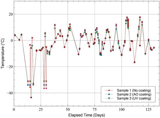 Table 2 lists the maximum, minimum and median values for the difference between temperature measured by temperature sensor and thermocouple in each phase for each sample. Sample 1 refers to the sample with no protective coating; sample 2 refers to the sample with UV protective coating, and sample 3 refers to the sample with AO protective coating. Median was included to provide an accurate assessment of the difference. In the case of sample 3, the median difference was within ±1 °C. This was within the measurement error range for AD590 which is ±1 °C as stated in the datasheet [28]. Sample 1 showed the same median deviation range except during the increasing phase. However, for sample 2, the median deviation range is up to 2.67 °C during the increasing phase. The MM temperature measurement method used an indirect method to measure heat. Therefore, there was additional heat input from the external PCB that has a minor effect on the temperature readings. In terms of the overall trend, there is no adverse difference between the temperatures recorded by thermocouples and temperature sensors. The MM temperature measurement method is feasible based on the obtained results.