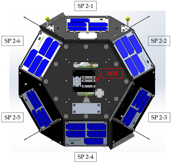 A comparison was performed with measured temperature value from temperature sensors on six solar panels nearest to the MM. Each solar panel has a temperature sensor like the one used for MM. The location of six solar panels near MM is shown in Figure 12. The purpose of the comparison was to validate the MM temperature sensor reading. The measured temperature from MM was within the range of the upper and lower limit from the solar panels, which was 50 and −45 °C, respectively. It should be noted there were minor variations between MM temperature sensor and solar panels. The temperature sensor of a solar panel was attached to aluminium. The thermal conductivity of aluminium is higher compared to CF/PEEK which contributed to the variation. Based on measured data and comparison with solar panels, the MM temperature sensor provided a feasible method to measure temperature.