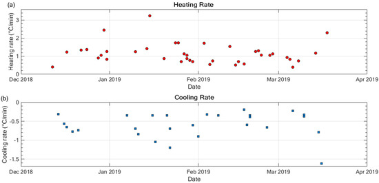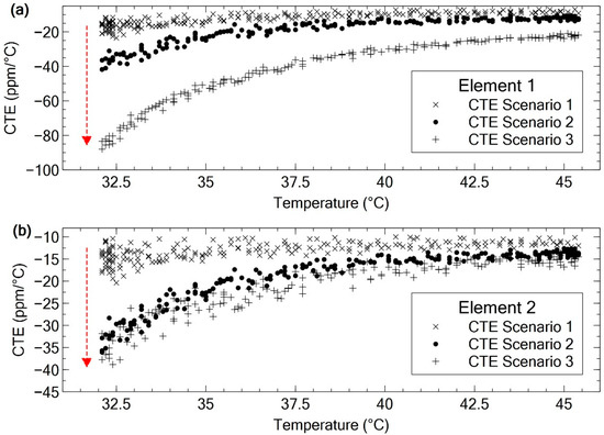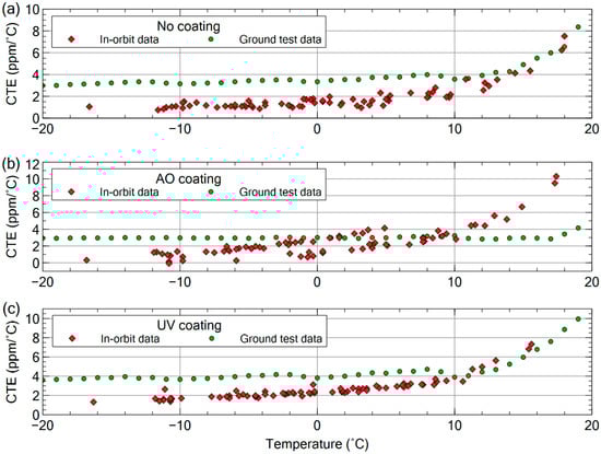 Figure 13 showed scattered CTE points but with a consistent upward curve. As mentioned in Section 3.2.2, the difference in heating and cooling rate in LEO affected the change in CTE. This resulted in the scattered points for CTE values. The effect of the variable heating and cooling rate on CTE had been shown in previous studies [31,32]. In the case of Ten-Koh, the variation in the heating and cooling rates was due to the absence of an AACS and few other variables listed below: