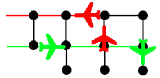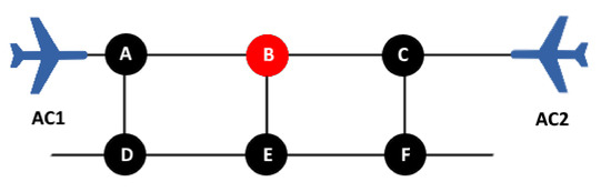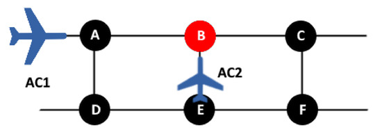 If the agent determines that the previous nodes of the Aircraft Agents are not the same, and they do not form the anticipated head-on conflict case, then the Aircraft Agents form an anticipated crossing conflict. In this case, the agent then executes the Anticipated Crossing Conflict Resolution Property. Figure 6 presents such an anticipated crossing conflict, where node B is the conflict node, node A is the previous node of , and node E is the previous node of .