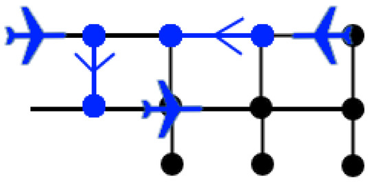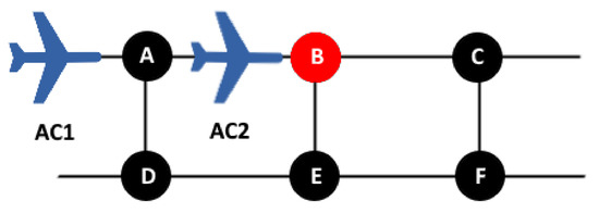 Finally, if the agent determines that the next and previous nodes of both Aircraft Agents are the same, then the Aircraft Agents are following each other. For this reason, they will maintain visual separation to each other. In this case, the agent takes no further action for this anticipated conflict. This is shown in Figure 7, where the previous node of both and is node A, and the next node of and is node C.
