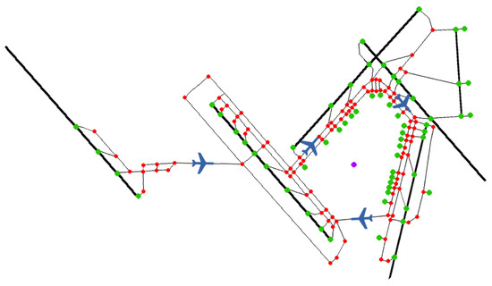 The graph representation of the taxiways and runways of Schiphol Airport. The red dots represent the ATC Agents. The green dots are the locations of the Entry/Exit Agents. The blue airplanes are the Aircraft Agents, and the purple dot is the Airport Operation Status Agent.