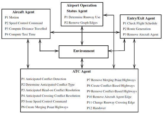 This section presents the specifications of the agents in the MAS. There are four types of agents: Entry/Exit Agents, Aircraft Agents, ATC Agents, and the Airport Operation Status Agent. Their properties and interactions are summarized in Figure 4.