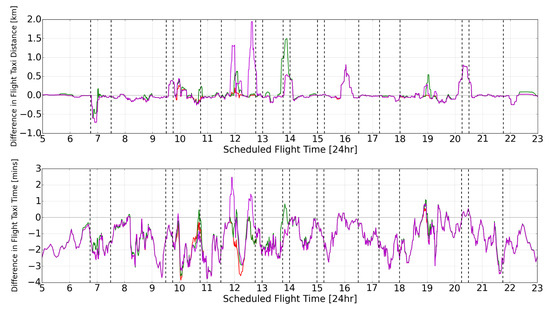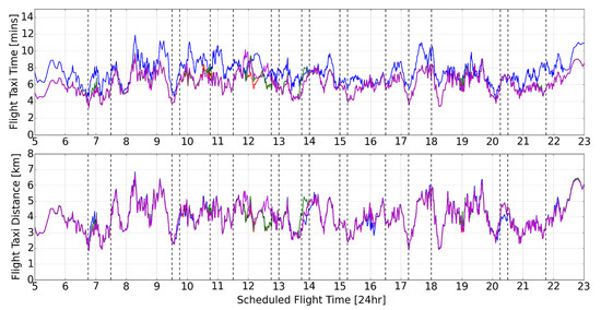Figure 9 expands on the results of Figure 8, and presents the taxi time and taxi distance moving average differences computed for each 10 flights with respect to the real-world. The results in Figure 9 show that all three mechanisms followed similar trends throughout the day, often overlapping in periods where there were no runway reconfigurations. The average difference in flight taxi time with respect to the real-world of the CBS mechanism was −1.35 min/flight, −1.27 min/flight for the CBS + MP HWYs, and −1.28 min/flight for the CBS + CB HWYs mechanisms. This indicates that all mechanisms resulted, on average, in a shorter taxi time with respect to the real-world operations, with the CBS exhibiting the greatest average saving per flight. The average difference in taxi distance of the CBS mechanism was −0.02 km/flight, and 0.02 km/flight for the CBS + MP HWYs and CBS + CB HWYs mechanisms. This indicates that there was, on average, no significant difference in taxi distance.