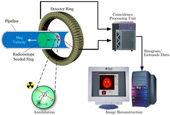 Conceptual schematic of the positron emission tomography (PET) system applied to studying pipe flow. (Modified from https://en.wikipedia.org/wiki/File:PET-schema.png per the sites creative commons license. Ref. [1]).
