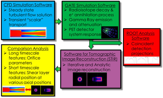 The primary objective of this study was to identify the required acquisition durations necessary for a modern PET system to adequately resolve the stated flow features given a fixed specific activity level and flow Reynolds number. This paper discusses details regarding the methodology undertaken to develop the study to meet this objective. In particular, details are provided regarding the use of a continuum-based computational fluid dynamics (CFD) technique combined with Monte Carlo-based probabilistic models to simulate the passage of a water/radioisotope solution through an orifice pipe flow, as well as the resulting photon emission and propagation through the fluid and containment material. The simulation input parameters are discussed followed by the simulation approach and its validation by way of comparison with data from the literature.