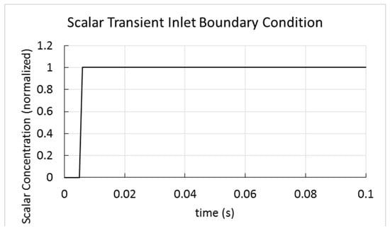 A passive scalar transport equation was solved to model the evolution of the F-18/water solution in the pipe after its impulsive injection. A ramp function at the inlet boundary was set to simulate the injection process. The ramp function is shown in Figure 6 where the scalar (radioisotope) concentration value was normalized by the respective maximum specific activities specified for the individual test cases.