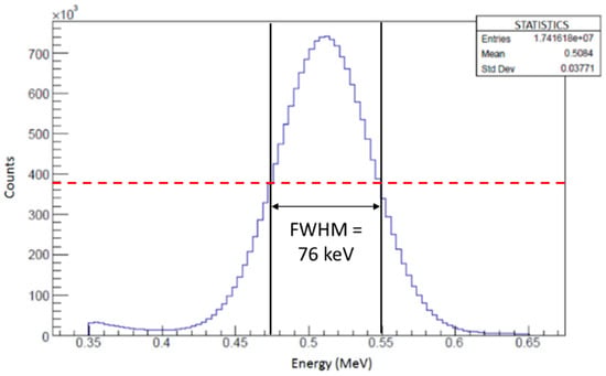 The GATE model for the Siemens Inveon system was extensively validated in previous work [12]. However, to ensure the input parameters were accurate for the current study, a truncated validation process was performed. This process consisted of simulating the system response and image reconstruction algorithm output for a 20 mm diameter spherical source of F-18 in solution with water, without a containment structure. The source is depicted within the field of view (FOV) of the detector in Figure 8. The resulting energy spectrum is shown in Figure 9 with a full width at half maximum (FWHM) of 76 keV, corresponding to a 14.9% energy resolution. This is in good agreement with the 14.6% energy resolution prescribed above, in addition to published F-18 spectra using LSO scintillating crystal-based systems [12,13]. The simulation of the systems response is conveyed with the histograms shown in Figure 10b–d, which represent projections of all coincident detections onto the x, y, and z axes, respectively. These projections are in good agreement with the normalized, theoretical source distribution generated assuming an infinite number of detections. This reference distribution is shown in Figure 10a.