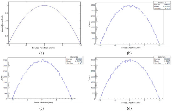 (a) Normalized theoretical detection histogram for a 20 mm diameter spherical source. GATE-simulated detection histograms projected on the X axis (b), Y axis (c), and Z axis (d).