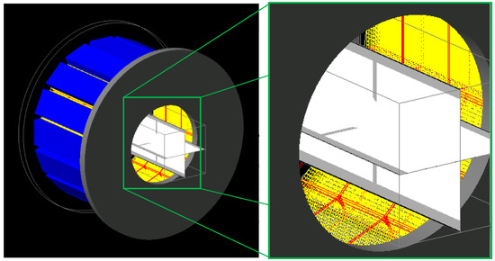 Additionally, an attenuation map was generated using the simulation geometry in order to spatially correlate the source with the physical material of the pipe and flowing media. This was done to accurately account for scattering and attenuation of emitted gamma-rays. The resulting flow geometry shown within the field of view of the modeled detector system is depicted in Figure 11. Although the figure only shows the orthogonal planes of the geometry, the Monte Carlo simulation accounts for the full three-dimensional effects of the flow geometry.