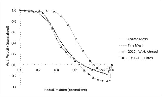 Radial profiles of the normalized axial velocity at the axial position of z/D = 1.0 obtained from the steady state flow field in Figure 13 indicate grid convergence of the results. The profiles are similar to those obtained by Ahmed for the same problem (2012) [16]. Ahmed employed the k-ε renormalization group (RNG) turbulence model to account for low-Reynolds-number effects. Compared to the simulation performed by Ahmed, the present profiles indicate a weaker reverse flow inside the recirculation region. Outside the recirculation region the agreement with the Ahmed profile is good. Also included in Figure 13 is a measured profile by Bates (1981) [17]. Interestingly, in the experiment the recirculation is also weaker than in the Ahmed simulation.