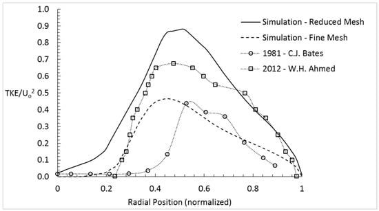 Radial profiles of the turbulence kinetic energy (TKE) from the centerline (r = 0) to the outer wall for an axial position of z/D = 1.0 are provided in Figure 15. The experimental profile by Bates was taken at z/D = 0.9. The TKE was normalized by the square of the freestream velocity (). It can be seen that the radial position of the peak TKE values for all simulation results, including those reported by Ahmed, are slightly shifted inward, towards the centerline, relative to the experimental data. The TKE peak value for the fine mesh is close to the experimental peak value. Larger peak values were obtained for the fine mesh simulation and the RNG simulation by Ahmed.