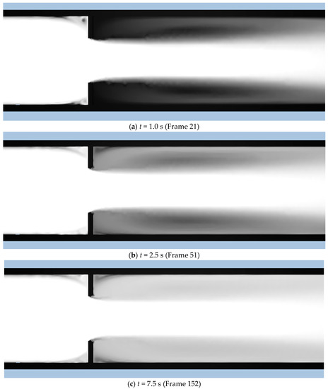 Concentration maps of the F-18 radioisotope species are shown in Figure 16a–c at 1.0, 2.5, and 7.5 s, respectively, after injection of the radioisotope. The leading edge of the labeled slug of fluid propagates to the orifice in ~0.2 s, which is the anticipated time based on the mean flow velocity and distance traveled. The F-18 media then traverses through the orifice and passes over the large recirculating flow regions downstream of the orifice. For t = 1.0, small separated flow regions can be discerned upstream of the orifice and the isotope is seen to be transported backward in the recirculating flow regions downstream of the orifice. The downstream shear-layer is clearly identifiable for several seconds with the F-18 concentration starting to diffuse into the recirculating region and beginning to approach a uniform distribution. Although F-18 concentration gradients are still present at 7.5 s post-injection, they have drastically diminished with the recirculating and core flow regions being difficult to discern from each other.