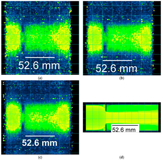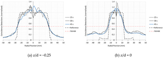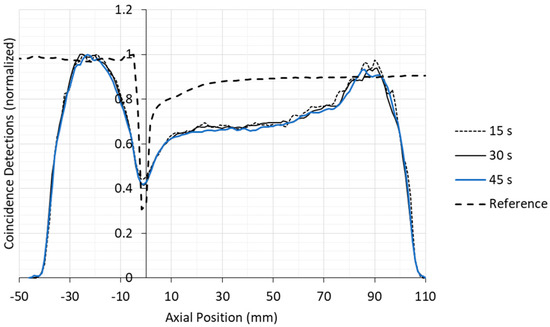 An axial projection of all detections on the pipe centerline was taken for each image reconstruction shown in Figure 17a through 17d; these axial profiles are shown in Figure 18. Each profile was normalized with its maximum value. These values are in the region upstream of the orifice due to the uniformly distributed concentration of radioisotopes across the flow. Smoothing of the profiles is exhibited as the acquisition time, and therefore number of detections, is increased, as is expected due to the Poisson-based probabilistic process of the photon detection. The projections of the emission data show a deviation from the reference projection starting just upstream of the orifice plate (~0.3 pipe diameters, ~−15.8 mm), up to approximately 1.5 diameters (78.9 mm) downstream of the orifice plate. Deviations from the reference profile resume to minor magnitudes further downstream, however only for a short axial distance before the edge of the scanners FOV is reached, where the number of detections drop off dramatically. This deviation is suspected to be attributed to an effective shadow being cast from the attenuation of emissions in the orifice plate material. The effects of this “shadow” are anticipated to be improved with a higher-resolution attenuation map utilized during the scatter correction process. The resolution of the attenuation map used for scatter correction was reduced to the extent that the orifice plate was no longer apparent. This was done to reduce the computational expense as the scatter correction process with the full resolution map resulted in prohibitively long computational times. An intermediate resolution level is anticipated to be an adequate compromise to reduce the attenuation effects on the image reconstruction process.