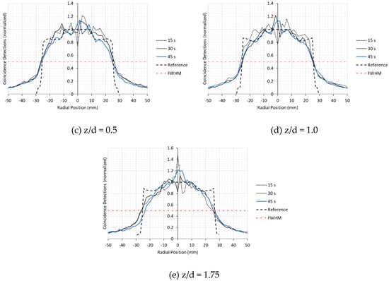 Transverse tomographic slices were taken at axial positions of z/d = −0.25, 0, 0.5, 1.0, and 1.75 (z = −13.2, 0, 26.3, 52.6, and 92.1 mm) for each test case. Radial profile plots were generated crossing through the pipe centerline for each of these slices. These profiles represent the root mean square averages taken over radial profiles from 0° to 180° at 5° increments. Coincidence detection values are normalized to the average detection values within the primary flow region for each respective profile. The profiles are shown in Figure 19a–e.