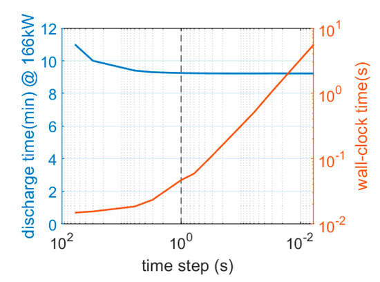 Before applying the model, a sensitivity analysis on the time step was performed by considering a power request of about 1/3 of and reducing the time step from 100 s to 0.01 s. The results are shown in Figure 1 in terms of discharge time and wall-clock time on an ATX Intel i7 8700 Workstation as a function of the time step. Please note that a time step of 1 s ensures sufficient accuracy in the estimation of the discharge time with a reasonable wall-clock time. Therefore, a time step of 1 s was applied to all the simulations performed in the present investigation.