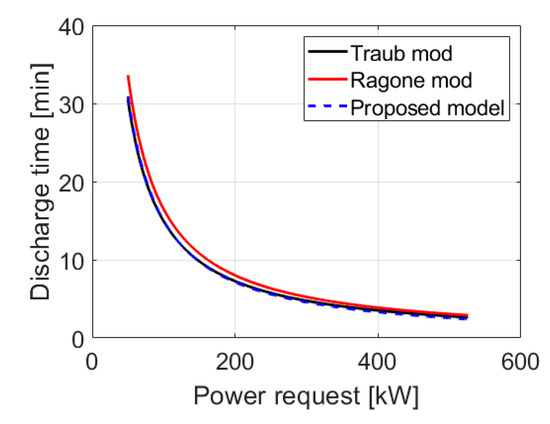 To validate the proposed model, the simulations were repeated with a battery power request ranging from 50 kW to the nominal power of the battery (526 kW). The results were compared in Figure 2 with the discharge times found with the “Traub mod” and “Ragone mod” models proposed in the previous investigation [24].