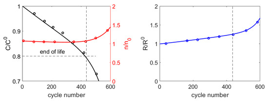 Please note that the results with N = 1 correspond to the nominal values of the battery parameters. The battery reaches its nominal end of life at cycle 436 when the capacity is reduced to 80% of the initial value.