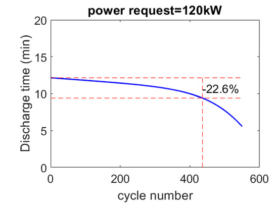 The aging model is applied in Figure 4 to the same battery of Table 2 with a required power of 120 kW to underline the effect of aging on the battery discharge time. Please note that along the battery life, the discharge time at 120 kW decreases from 12.15 min at the beginning of the life to 9.4 min at the end of life.