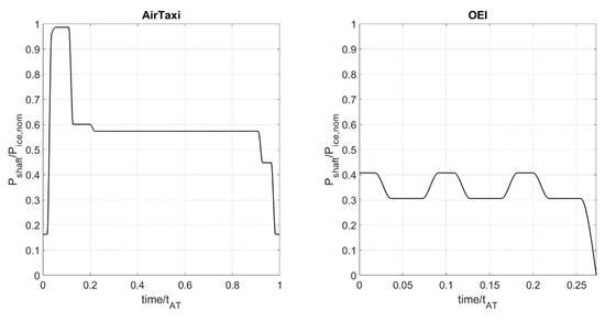 According to the experience of the authors about aerial vehicles for urban air-mobility, a hypothetical Airtaxi mission is considered. It is described in terms of the mechanical power request at the rotor shaft, altitude, and flight time in Table 4. Because of a confidentiality agreement, the power request is scaled with respect to the nominal power of the turboshaft engine (). Similarly, the flight time of each phase is scaled with respect to the total flight time of the AirTaxi mission ().