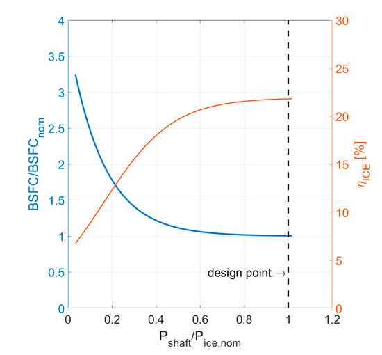 In the case of strategy #1, i.e., when the battery is not used, the engine is required to work with a very variable load (ranging from the minimum to the maximum power request of the mission). This means that its BSFC ranges from the nominal value at the design point to about twice this value when the power request is very low (startup and shutdown).