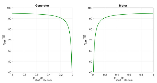 The proposed model, generate for an electric machine with a nominal power of 120 kW, the efficiency curves shown in Figure 9.
