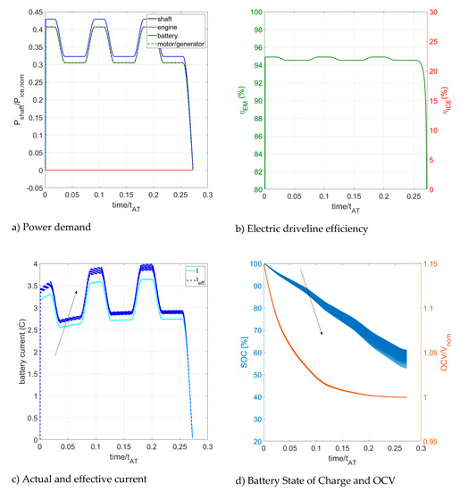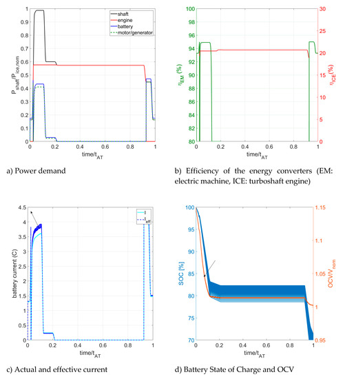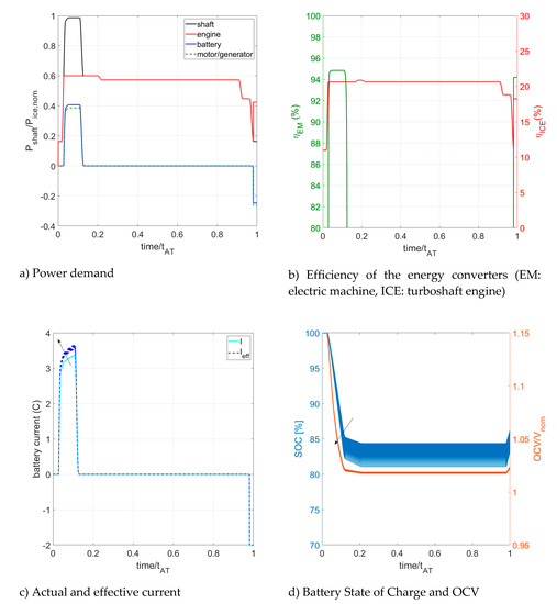 Figure 10 presents the results of the proposed model applied to the OEI mission that is performed without the usage of the engine (to simulate its failure) and with the battery initially fully charged (). In particular, the plot of Figure 10a shows how the total power demand of the shaft is satisfied by power system. Figure 10b shows the efficiency of the two energy converters (in this case only the electric machine). The actual and effective currents of the battery are reported in Figure 10c while Figure 10d details the values of battery SOC and OCV.