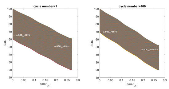 To find the minimum value of the SOC at the beginning of the OEI mission, the initial SOC decreased until the SOC at the end of the OEI mission reached the value at which a Li-ion battery is considered fully discharged i.e., . The calculation was repeated when the battery is closed to its end of life (cycle number = 400) and the results are reported in Figure 11.