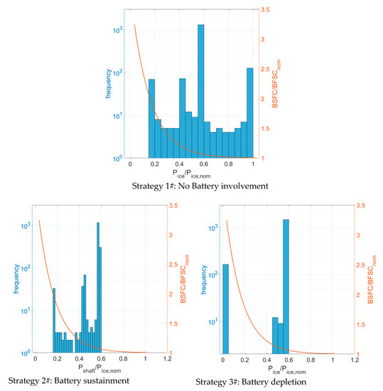 The improvement of fuel economy with strategy #2 and #3 is due not only to the fact that the battery helps the engine but also to the enhancement in the engine efficiency as shown in Figure 14 where the frequency distribution of the engine power request is superimposed to the BSFC vs. engine power line.