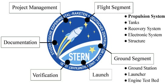 The main objective of the STERN program is the provision of experience for students in overall system design. A complete rocket system is to be designed with different subsystems to achieve the project requirements. This includes ground segment design, system operation design, project planning, and documentation. An overview of the whole project content is presented in Figure 1. Various subsystems of the rocket are addressed within the flight segment. This is also shown in Figure 2, where the rocket subsystems are visualized. One main subsystem is the propulsion system, where the engine and valve and feeding systems are designed. The engine design and verification are emphasized in this article.