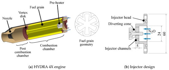After the successful application of the HYDRA 3X engine, the HYDRA 4X engine for the Faust II propulsion system was planned. It uses pure HTPB as fuel, waiving additional aluminum powder. This propellant is cast into the engine at a liquid state. It cures by using hardener and therefore becomes solid. The grain geometry is created by using a casting mold that is removed after the curing process. The structure parts are made from phenolic paper, while the nozzle throat is additionally supported with graphite. The structure must be able to withstand the combustion pressure loads. Thus, the engine is equipped with a CFRP laminate coating that resists the operational pressure. The injector head is based on the design of HYDRA 3X. It is a shower-head injector with channel orifices of . A diverting cone is added, as shown in Figure 4b. The oxidizer flow impinges on this cone, which diverts the flow and directs it to the fuel grain. The current design of HYDRA 4X is presented in Figure 4a and key data in Table 2, respectively.