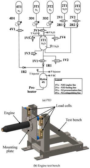 The oxidizer feeding line is mounted to the test bench and leads directly to the test injector. Liquid NO is inserted into the engine through this component during the hot test. At this point, additional measurements are taken: temperature and pressure shortly in front of the injector are measured, as well as the combustion chamber pressure by a sensor connected to a small pipe that leads directly into the engine pre-chamber. Pressure is measured at a sampling rate of . The test bench is a robust steel construction that is modular and can be used for different engines, as is displayed in Figure 5b. The HYDRA 4X is mounted to the test bench using a mounting plate, which accommodates the injector and can easily be exchanged. Four load cells are integrated onto the test bench for thrust measurement. Data logging and valve controlling are realized by the National Instruments controller [29]. It is located within an electronic box near the fluid supply system and can be controlled remotely from the test control center.