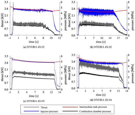 Engine test data for HYDRA 4X-01 (a), 4X-02 (b), 4X-03 (c), and 4X-04 (d).