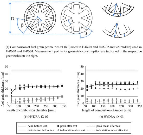 As a result, the fuel grain geometry was changed for the test of HYDRA 4X-03 as presented in Figure 7a with parameter values summarized in Table 6. The number of star peaks was decreased from eight to six, and the geometry was changed so that consumption of star indentations was augmented. The consumption measurements of HYDRA 4X-03 showed that the design changes enhanced the HTPB consumption, especially for star indentations, as can be seen in Figure 7c. Additionally, a more even consumption along engine length was demonstrated. Therefore, a higher mean thrust value of about at a chamber pressure of could be reached, as presented in Figure 6c. These values were still below the design parameters, which could be traced back to a low oxidizer mass flow. As a result, the injector was adapted once more between Tests 03 and 04 by increasing the number of injecting orifices.