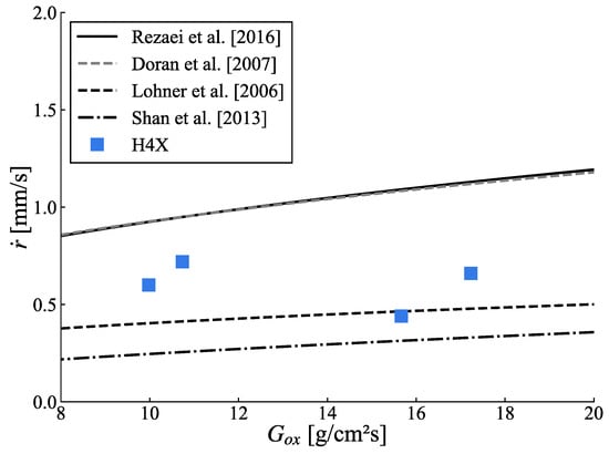 Figure 8 shows the fuel grain regression rates obtained from the four tests compared against data from the literature [8,31,32,33]. The regression rate curves from these data follow the empirical power law [7]: