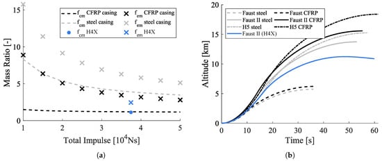 (a) Mass ratios and for steel and CFRP casing materials; (b) Flight trajectories until apogee altitude for three different rocket designs, again with steel or CFRP casing material