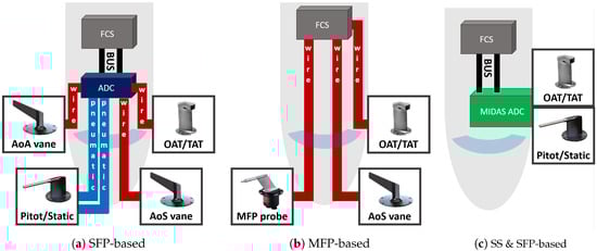 The current ADS state-of-the-art mainly enables two kinds of solutions: one based on single function probe (SFP) (Figure 1a), the other one based on multi function probe (MFP) (Figure 1b). As can be deduced from Figure 1b, MFPs integrate the necessary transducers so that they can be directly connected to a FCC instead of using dedicated devices (e.g., air data computer ADC) as in the case of the SFP-based solution. Moreover, MFPs also provides a measurement of a local flow angle in addition to pressure measurement. A third innovative category is (partially) based on synthetic sensors and one possible example is shown in Figure 1c inspired to the MIDAS project.