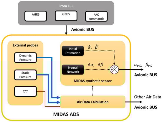 In this work, synthetic sensors for aerodynamic angles are based on neural network techniques, as presented in previous works [,]. The core of the Smart-ADAHRS patent relies in exploitation of the already available data measured from attitude and heading reference system (AHRS) and ADS to provide an estimation of the aerodynamic angles, angle of attack () and angle of sideslip (), as described in Figure 2b.