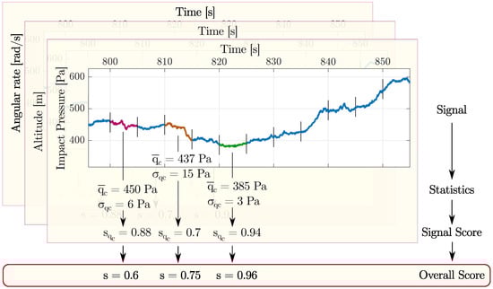 For each interval sample mean, sample standard deviation and the deviation between the minimum and maximum values covered by the signal inside the sample are calculated. A score is hence assigned to each interval depending on the descriptive values calculated beforehand. The decision on which statistics consider for the score assignment grounds on the type of signal evaluated. In some cases, the score depends on how much the sample mean is close to a given value. For instance, the angular rates must be zero in stationary conditions. In other cases, when the interest falls in observing a constant signal, the sample standard deviation or the maximum deviation drives the score assignment. For instance, the closer the maximum deviation of the impact pressure is to zero, the higher is the assigned score.