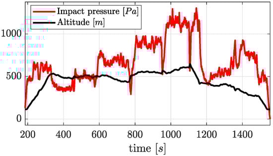 A second equipment, the Smart-ADAHRS demonstrator, is installed on board. This system is equipped with an independent ADAHRS platform integrated with GNSS. The only parts shared by the Mnemosine and Smart-ADAHRS are the pressure ports, probes and the first segment of pneumatic links. The aerodynamic angles of the aircraft have been measured by two vanes mounted on a Pitot-boom structure. An example of the flight data recorded during one flight test can be seen in Figure 9.