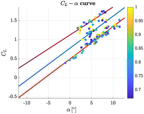 To evaluate the capability of the DIGS method, the curve is identified from flight test records not performed for this scope. As a result that no engine measurement is available on-board, a fuel consumption linearly decreasing with time has been assumed. In this way, it is possible to evaluate the lift coefficient as , where m is the aircraft mass, g is the gravitational acceleration, is the impact pressure and S is the wing surface area. It is interesting to note that the obtained samples organize on three straight lines in Figure 10. In fact, some of them corresponds to flaps down in Take-Off (about 14) and Landing (about 36) conditions. As a result that the flap angle deflection, for leading edge plain flap, is equivalent to offset the null lift direction with an angle proportional to the , it is possible to identify two analytic values of to compare our results. In fact