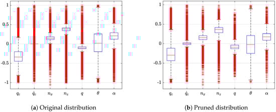 Comparison of hypercube normalized distribution on original training pattern and after Data-Driven Identification and Generation of Quasi-Steady States (DIGS) and Similar Flight Test Data Pruning (SFDP) method application. Global points are reduced from 980,191 to 27,318, outliers reduced from to .