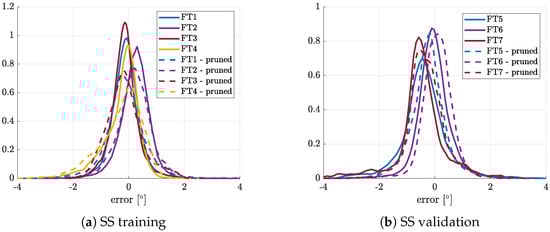 The Figure 13 collects the error PDF for AoA estimation obtained both for the SS training and test. Obviously, the flight tests used for the training are pruned as described in Section 5, whereas the flight test records used for SS test are not pruned and they are the same used in [].