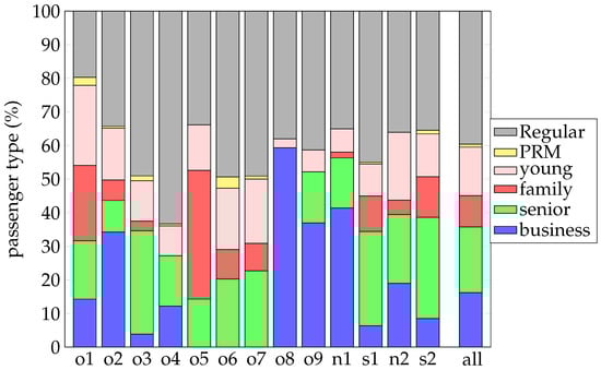 Figure 2. This figure also shows an aggregate distribution of all passengers in the dataset. About one in six passengers in the dataset is of type business (16.1%), and about 20% is a senior passenger. 9% of passengers falls in the family category, and 14% is a young passenger. Less then 1% of passengers falls in the PRM category, and the remaining 40% of passengers is a regular passenger. Comparing this distribution of passengers type to passenger statistics of 2017 [