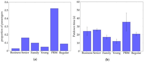 Figure 4 shows the proportion of passengers that receive a patdown, and the corresponding mean times this patdown takes. PRM passengers receive a patdown in over 50% of the cases, while business passengers receive a patdown in less than 3%. Business passengers are familiar with the processes and do not take illegal items with them. PRM passengers often do not go through the WTMD, and therefore have to be checked manually. Mean patdown times are from 12 s (young) to 35 s for PRM passengers. These differences can occur due to the type of check that is performed. PRM passengers often received a full patdown as they do not always go through the WTMD. Young passengers frequently identify the item that triggered the WTMD alarm quickly.