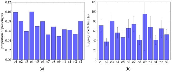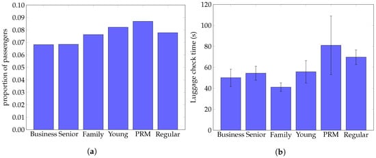 Figure 5 shows proportion of passengers that receive a luggage check, and the corresponding mean times this luggage check takes. Luggage check percentages range from 6.8% (business) to 8.7% (PRM). Mean luggage check times for different passenger types have a large variation: they range from 41 s (family) to 81 s (PRM). The low luggage check time for families might be due to a relative quick check of baby milk that is commonly performed.