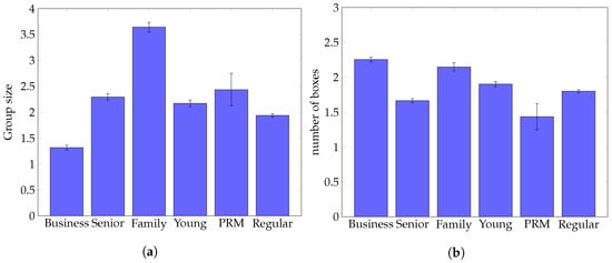 Figure 6. All passenger types travel in groups of about 2 (on average), but business passengers predominantly travel alone (mean group size of 1.3 passengers), and a family travels in larger groups (mean group size of 3.6 passengers). PRM passengers use the lowest number of boxes (1.4 boxes on average), and business passengers use the most (2.3 boxes on average). Business passengers often carry laptops that have to be put in a separate box. PRM passengers are commonly accompanied by a caretaker, who carries most of the personal belongings of the PRM passenger.